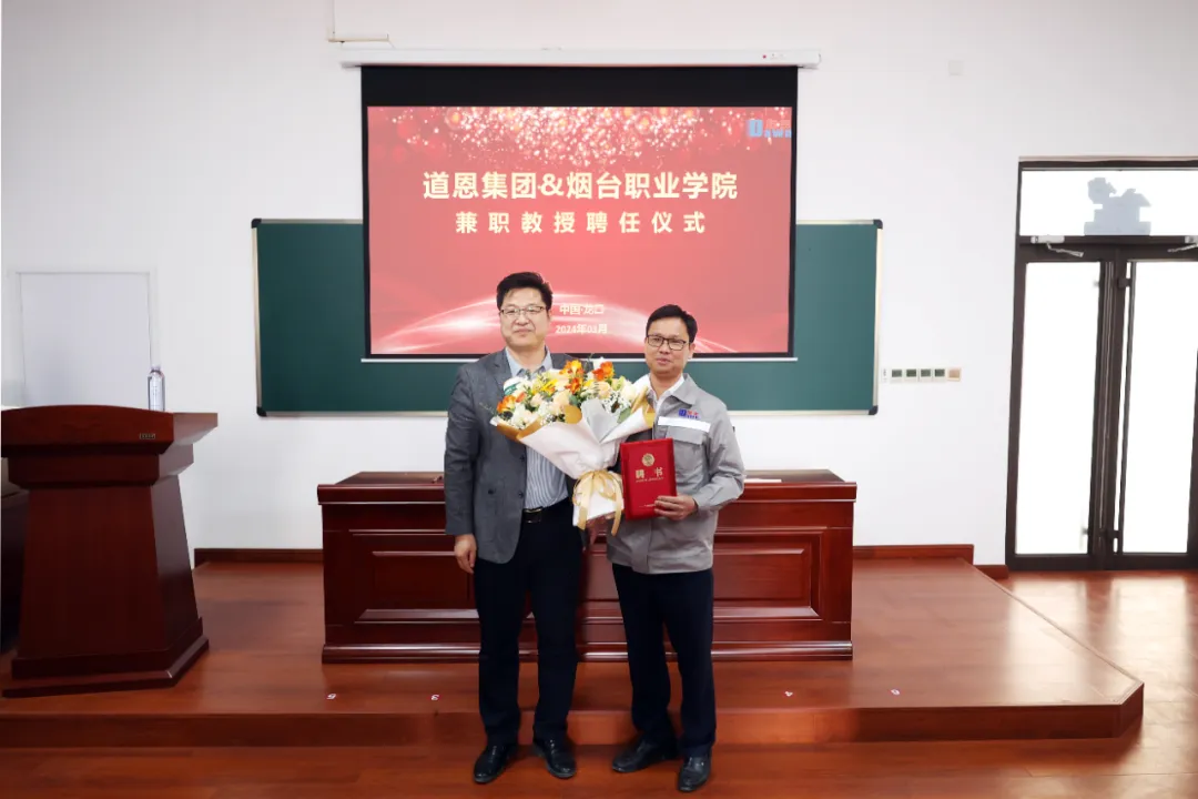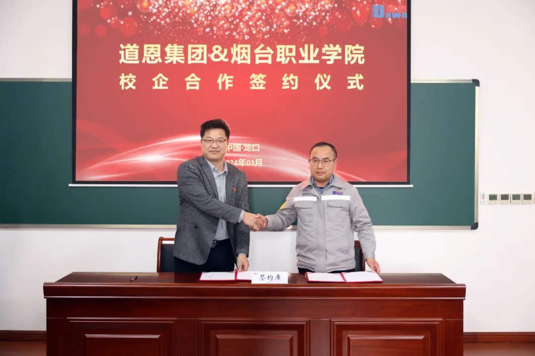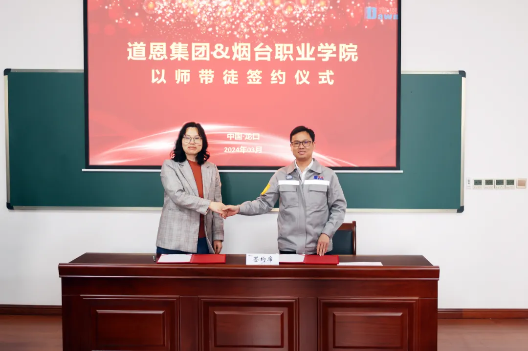 作為煙臺職業學院兼職教授,道恩股份總經理田洪池與該院博士代表蘇玲簽訂了以師帶徒協議。他在發表感言時表示,本次校企合作實現了創新鏈、產業鏈、人才鏈的高效融合,廣大科研工作者要秉承家國情懷,將科研作為事業,把科研實力轉化為自身的志氣、骨氣和底氣。