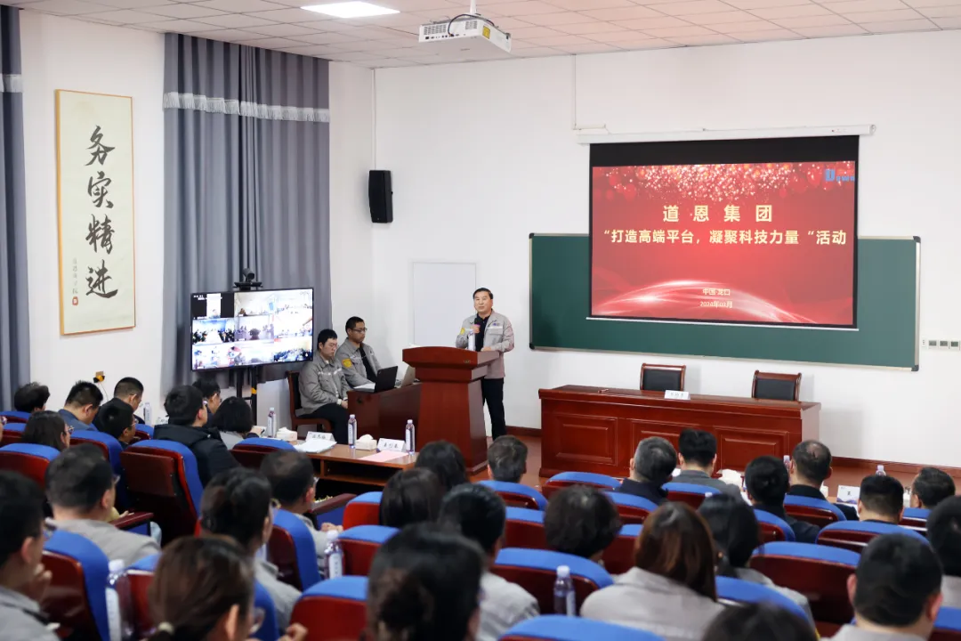 3月21日下午,道恩集團在大學生公寓學術報告廳召開校企合作暨科研工作者大會,同時設10個視頻分會場。龍口市委常委、組織部部長姜利春,煙臺職業學院黨委委員、組織人事處處長邢勤,道恩集團董事長、總裁,道恩商學院院長于曉寧出席活動并致辭,龍口市人社局、工信局、科技局,煙臺職業學院,道恩集團有關領導、教師及研發人員參加活動。