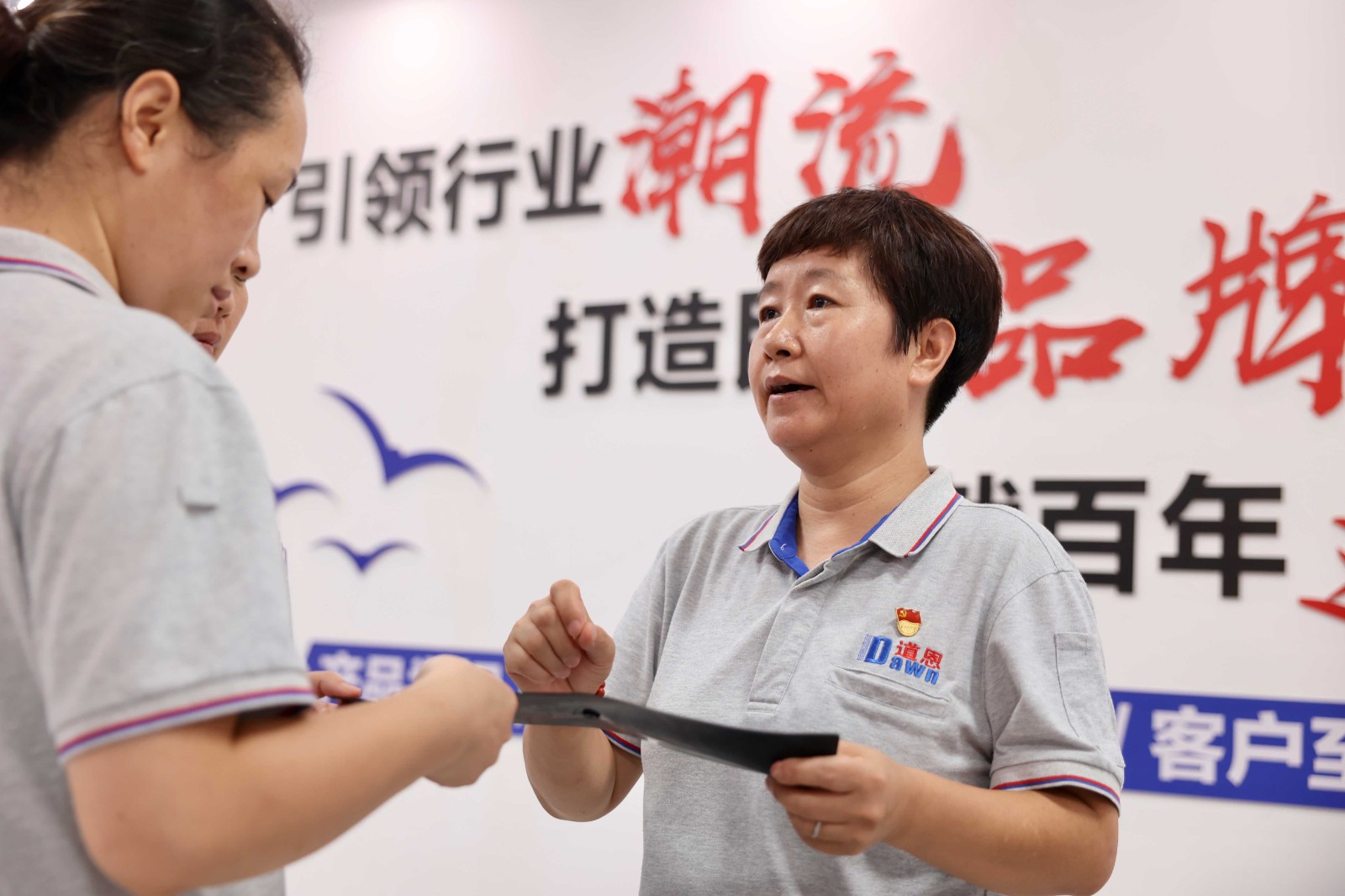 王紅與同事交流工作