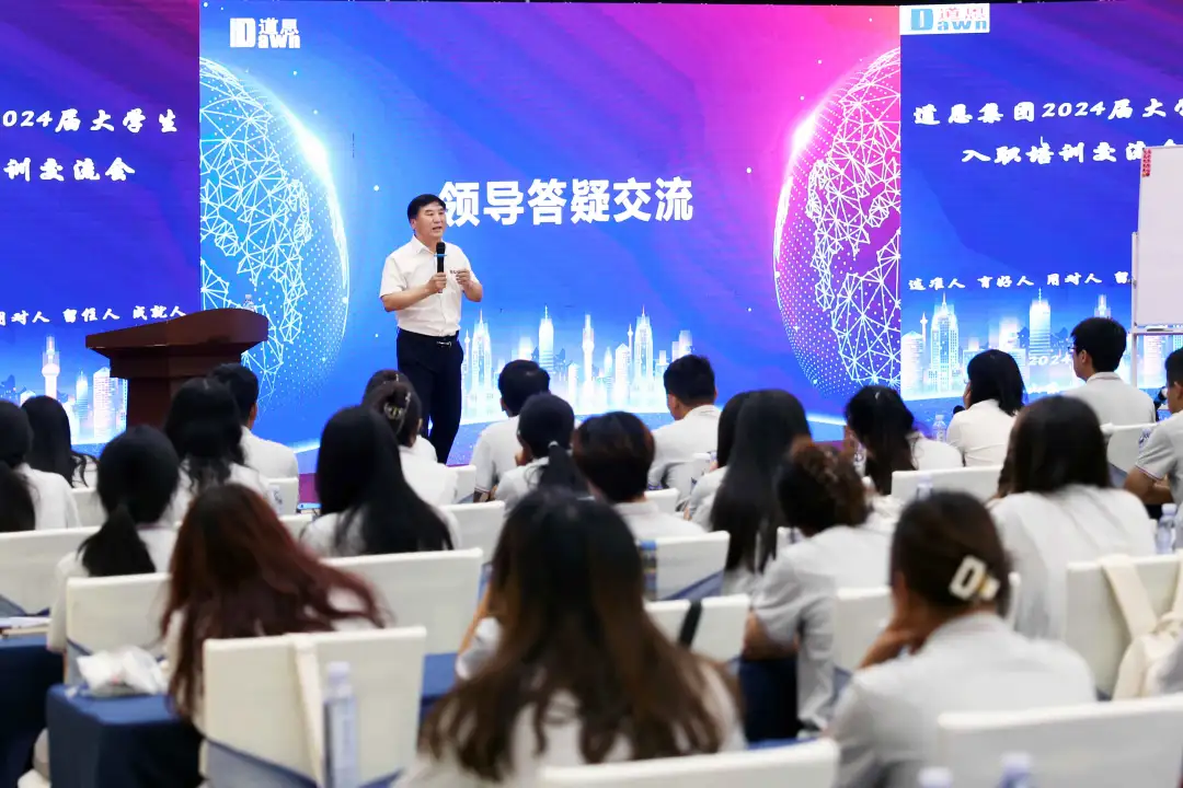 “33年前,在與你們年齡相仿的時候,我帶領5個人的小團隊踏上了創業征程,一路披荊斬棘,風雨兼程,在改革開放的大潮中,搶抓發展機遇,帶領道恩完成了從無到有、從小到大、從弱到強的華麗蛻變。”于曉寧董事長與新員工分享創業經歷,闡述了未來的產業規劃、戰略目標、指導思想,深情寄語大家“不斷超越,勇攀高峰,在融入道恩發展中實現自己的人生價值。”