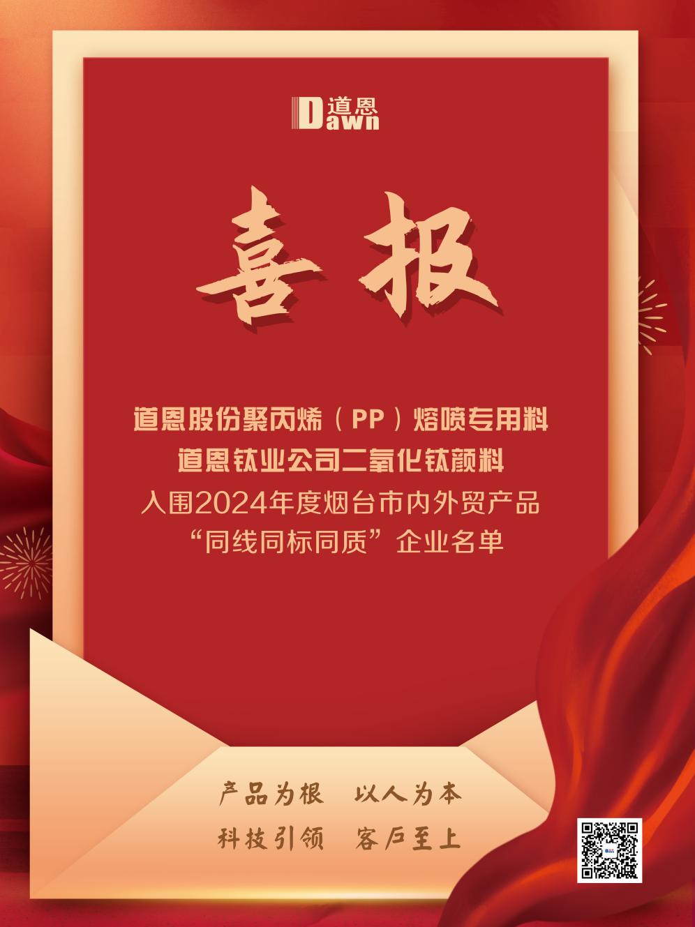 8月30日,煙臺(tái)市市場(chǎng)監(jiān)督管理局、煙臺(tái)市商務(wù)局發(fā)布2024年度煙臺(tái)市內(nèi)外貿(mào)產(chǎn)品“同線同標(biāo)同質(zhì)”企業(yè)名單,道恩股份的聚丙烯(PP)熔噴專用料、道恩鈦業(yè)公司的二氧化鈦顏料名列其中,是龍口市唯一入選該名單的企業(yè)。
