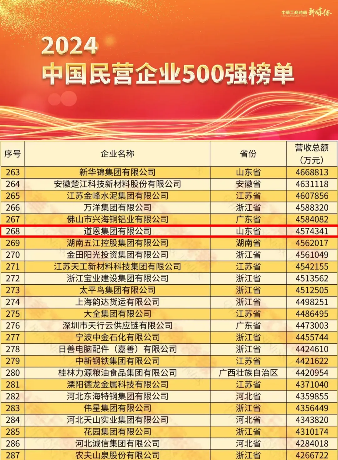10月12日下午,2024中國民營企業(yè)500強發(fā)布會暨全國優(yōu)強民企隴上行在甘肅省蘭州市舉行,道恩集團憑借457.4億元的營業(yè)收入位列268名,較去年躍升27個位次。此前的9月23日,在黑龍江省哈爾濱市舉行的全國民營企業(yè)科技創(chuàng)新與標(biāo)準(zhǔn)創(chuàng)新大會上,發(fā)布的“2024民營企業(yè)發(fā)明專利500家榜單”顯示,道恩集團和道恩股份分列第252位和第447位,展示了企業(yè)蓬勃向上的經(jīng)營實力、科研能力和新質(zhì)生產(chǎn)力。