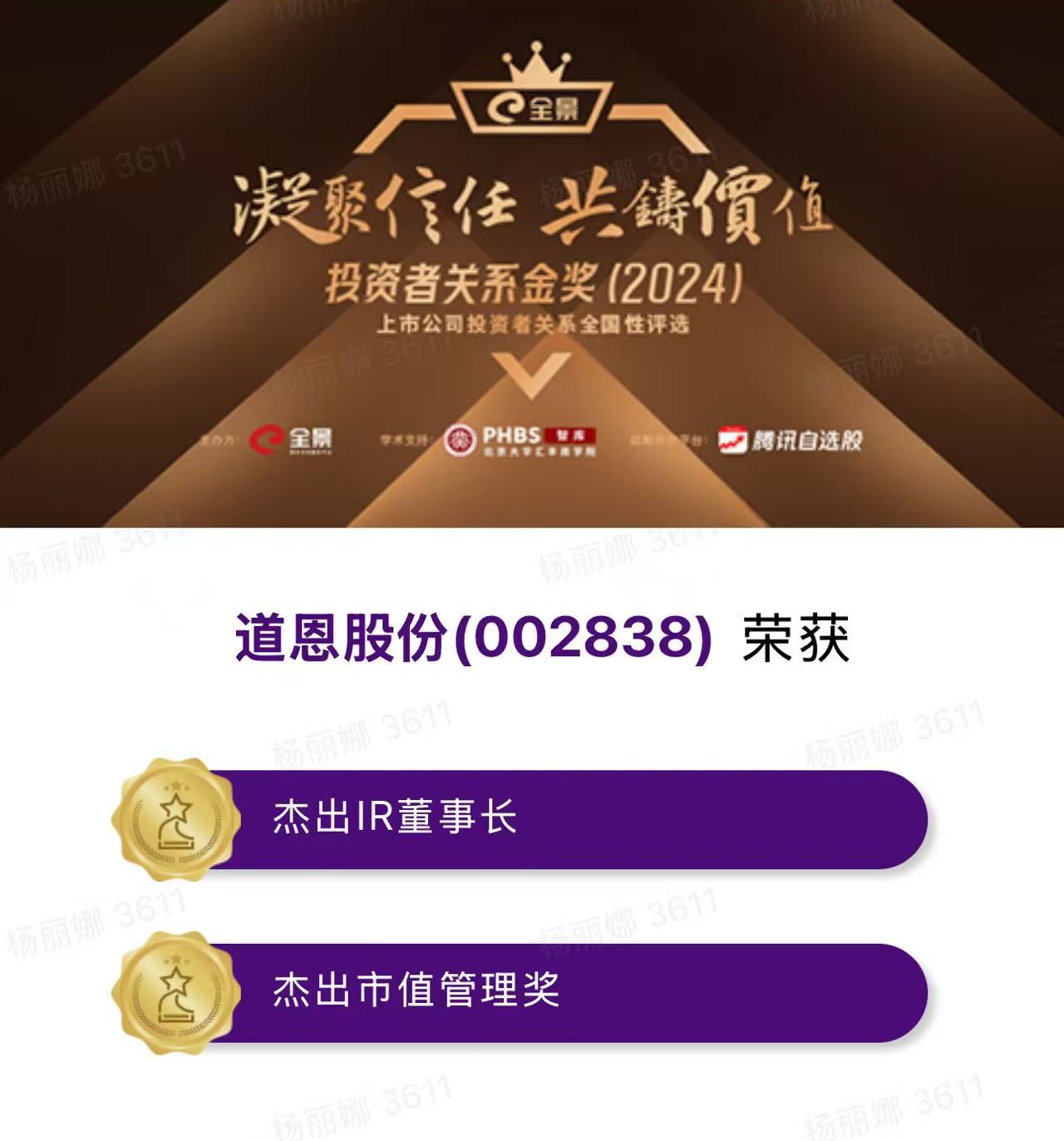 8月27日下午,第六屆“全景投資者關(guān)系金獎(jiǎng)”線上發(fā)布盛典揭曉獲獎(jiǎng)名單,道恩股份董事長(zhǎng)于曉寧榮膺“杰出IR董事長(zhǎng)”,公司榮膺“杰出市值管理獎(jiǎng)”,彰顯了不斷提升的IR投資者關(guān)系管理和市值管理水平。此前的2021年,道恩股份曾榮獲“全景投資者關(guān)系金獎(jiǎng)”之“業(yè)績(jī)說明會(huì)勤勉獎(jiǎng)”。