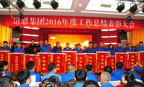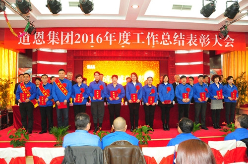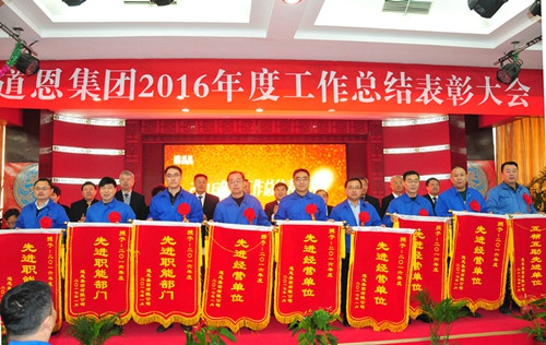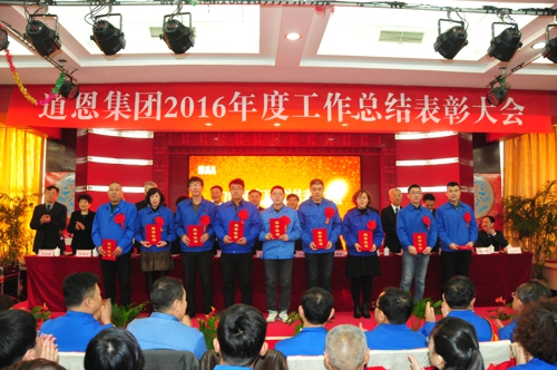 1月24日上午,道恩集團2016年度總結表彰大會在道恩湖畔酒店三樓多功能廳隆重舉行。集團公司董事長于曉寧、總裁索延輝出席大會并發表講話。