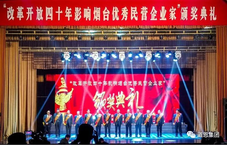 12月28日,煙臺(tái)市民營(yíng)企業(yè)協(xié)會(huì)、煙臺(tái)日?qǐng)?bào)傳媒集團(tuán)聯(lián)合舉行“改革開(kāi)放四十年影響煙臺(tái)優(yōu)秀民營(yíng)企業(yè)家“評(píng)選活動(dòng)頒獎(jiǎng)典禮,會(huì)上,共20名功勛民營(yíng)企業(yè)家、50名優(yōu)秀民營(yíng)企業(yè)家受到表彰,道恩集團(tuán)董事長(zhǎng)于曉寧榮獲“改革開(kāi)放四十年影響煙臺(tái)功勛民營(yíng)企業(yè)家”榮譽(yù)稱(chēng)號(hào),道恩集團(tuán)副總裁劉勇波應(yīng)邀出席活動(dòng)。
