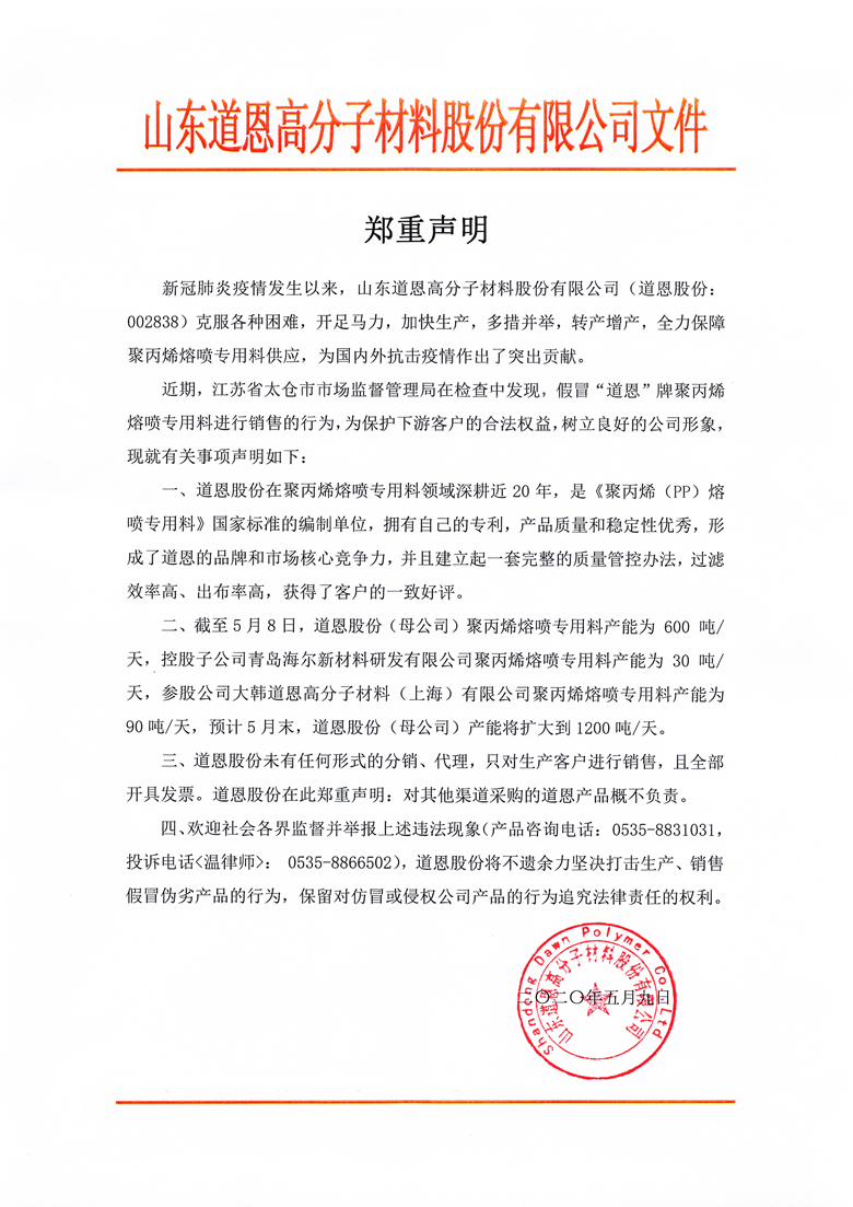近期,江蘇省太倉市市場監(jiān)督管理局在檢查中發(fā)現(xiàn)假冒“道恩”牌聚丙烯熔噴專用料進(jìn)行銷售的行為,為保護(hù)下游客戶的合法權(quán)益,樹立良好的公司形象,現(xiàn)就有關(guān)事項(xiàng)聲明如下: