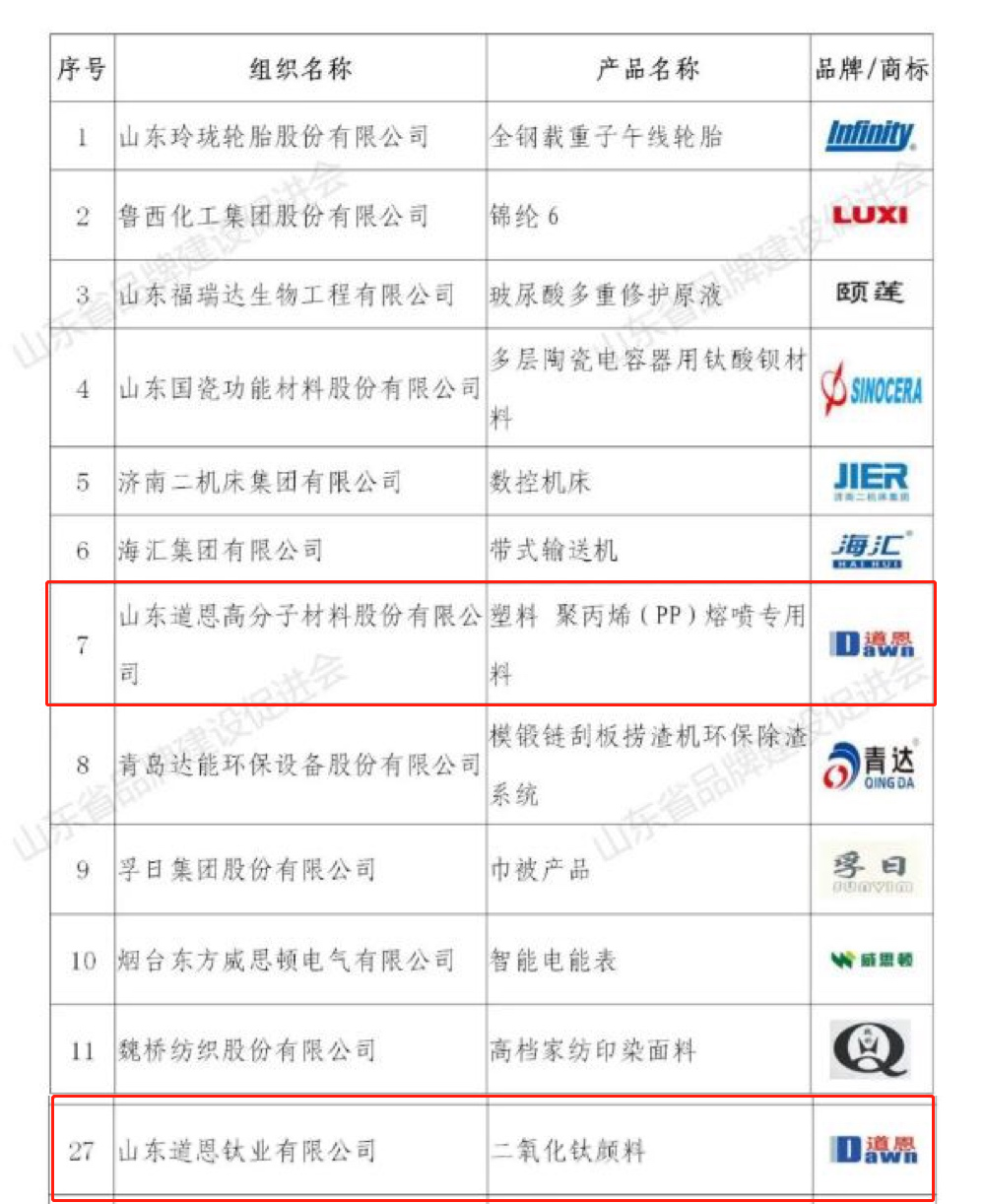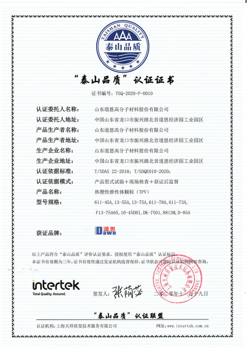 日前,道恩股份“熱塑性彈性體(TPV)”產(chǎn)品通過“泰山品質(zhì)”認(rèn)證, 成為“代表山東制造”的高端品牌。同時,在剛剛結(jié)束的2020年度山東知名品牌認(rèn)定工作中,道恩股份聚丙烯(PP)熔噴專用料、道恩鈦業(yè)公司二氧化鈦顏料(金紅石型鈦白粉)被認(rèn)定為山東知名品牌(產(chǎn)品)。由此看出,道恩產(chǎn)品的品質(zhì)越來越高端,道恩品牌影響力越來越大。