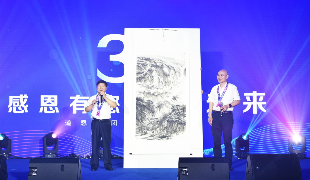 隨后,主持人宣讀了中石油、中石化等國內(nèi)知名客戶以及浙江大學(xué)等高校發(fā)來的賀電與賀信。在活動(dòng)現(xiàn)場,青島科技大學(xué)校長陳克正帶來了一份特殊的禮物——《驪山印象》圖。“從畫中可以看到,山氣勢磅礴,層巒疊嶂,高聳入云,林木遍野;寓意著道恩背靠青山,事業(yè)穩(wěn)固;山水相間,財(cái)源滾滾。”主持人如是介紹。