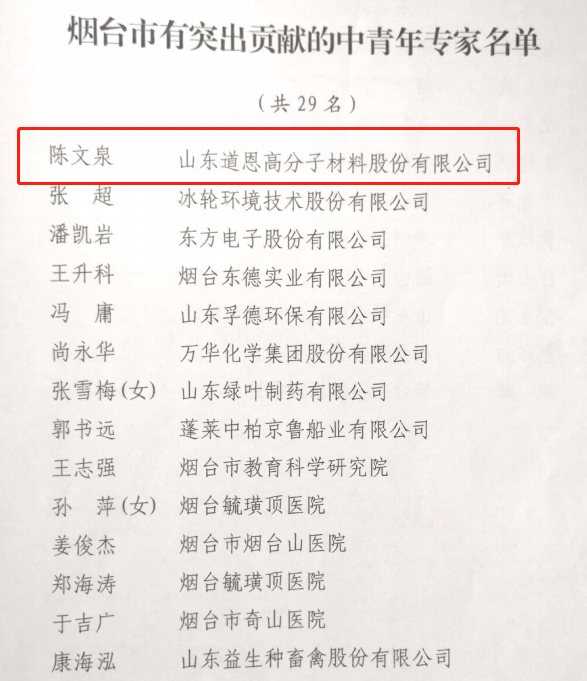 日前,煙臺市政府公布了煙臺市有突出貢獻的中青年專家人員名單,道恩股份總監(jiān)、副總工程師陳文泉名列其中。這是繼道恩股份總監(jiān)劉曉平之后,道恩又一位科研工作者獲此殊榮。