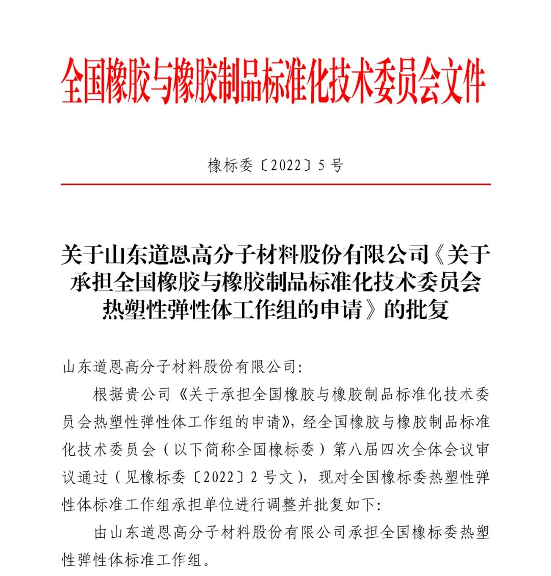 3月14日,山東道恩高分子材料股份有限公司(簡稱道恩股份)《關于承擔全國橡膠與橡膠制品標準化技術委員會熱塑性彈性體工作組的申請》,獲得全國橡膠與橡膠制品標準化技術委員會(簡稱全國橡標委)正式批復。此舉標志著這一全國標準化工作組落戶道恩,將有利于貫徹落實國家標準化工作的方針政策,提高熱塑性彈性體領域標準化水平和行業(yè)競爭力。