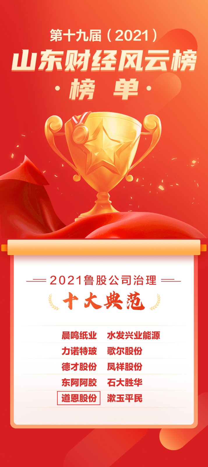 6月28日下午,“奮力走在前——第十九屆(2021)山東財(cái)經(jīng)風(fēng)云榜”頒獎(jiǎng)盛典在濟(jì)南舉行。道恩股份榮獲“2021山東財(cái)經(jīng)風(fēng)云榜魯股公司治理十大典范”。