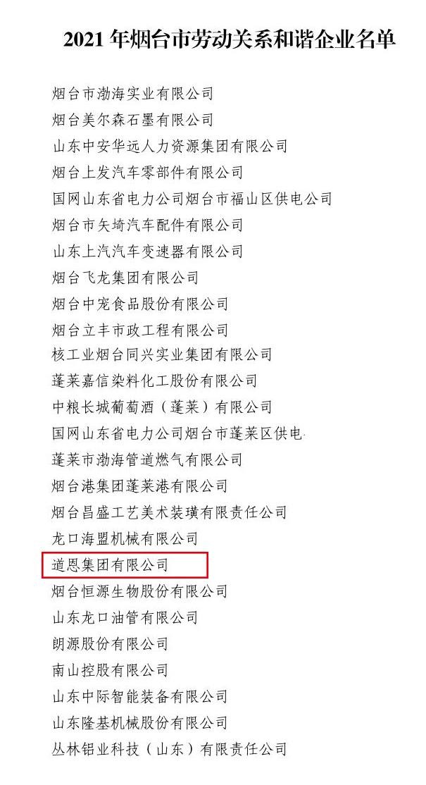 8月2日,煙臺市公布2021年度煙臺市勞動關(guān)系和諧企業(yè)、煙臺市勞動關(guān)系和諧工業(yè)園區(qū)名單,道恩集團(tuán)榜上有名,榮獲“煙臺市勞動關(guān)系和諧企業(yè)”稱號。據(jù)悉,道恩集團(tuán)所在的龍口經(jīng)濟(jì)開發(fā)區(qū)榮獲“煙臺市勞動關(guān)系和諧工業(yè)園區(qū)”稱號。