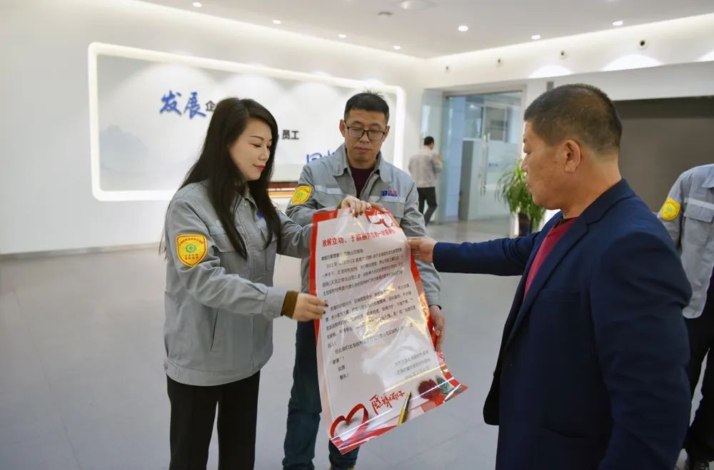 11月12日上午,龍口市龍港街道北皂前村黨總支書記姜思成,攜帶一面印有“疫情面前勇擔當、協同抗疫暖人心”字樣的錦旗和一封感謝信,走進道恩集團總部大樓,對該集團員工解立功、于麗麗在村居封控期間,參與抗疫志愿服務的愛心行動深表敬意和謝意。