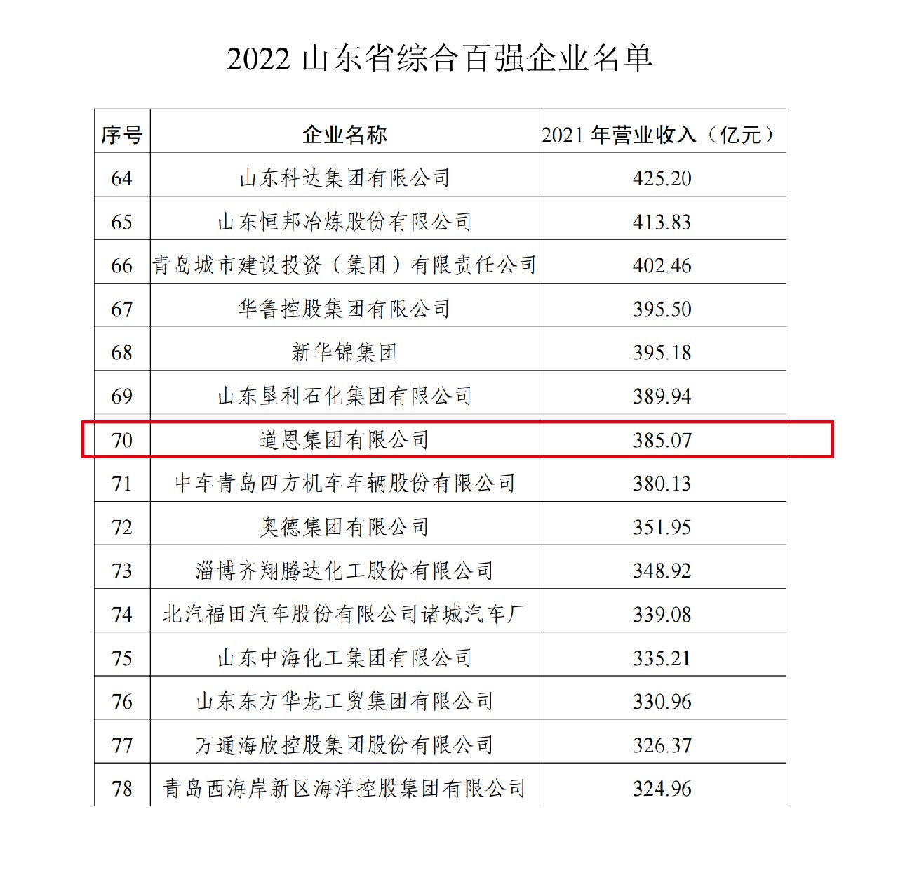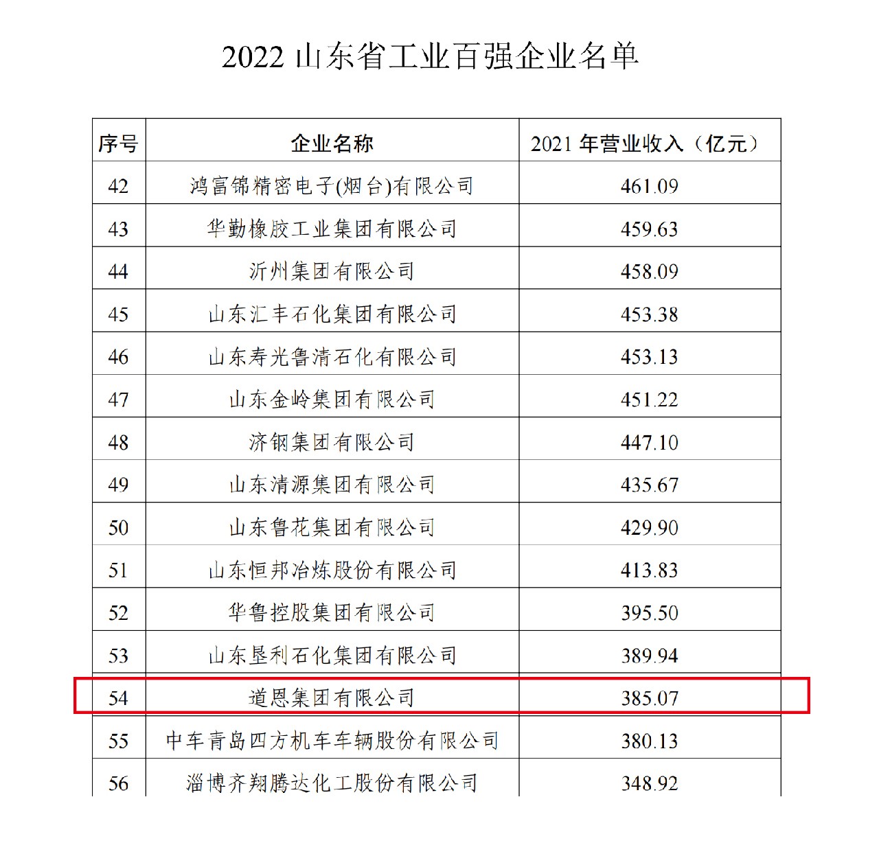 近日,山東省工業(yè)和信息化廳、山東省企業(yè)聯(lián)合會公布2022山東企業(yè)百強名單,道恩集團入選綜合百強企業(yè)第70名和工業(yè)百強企業(yè)第54名。