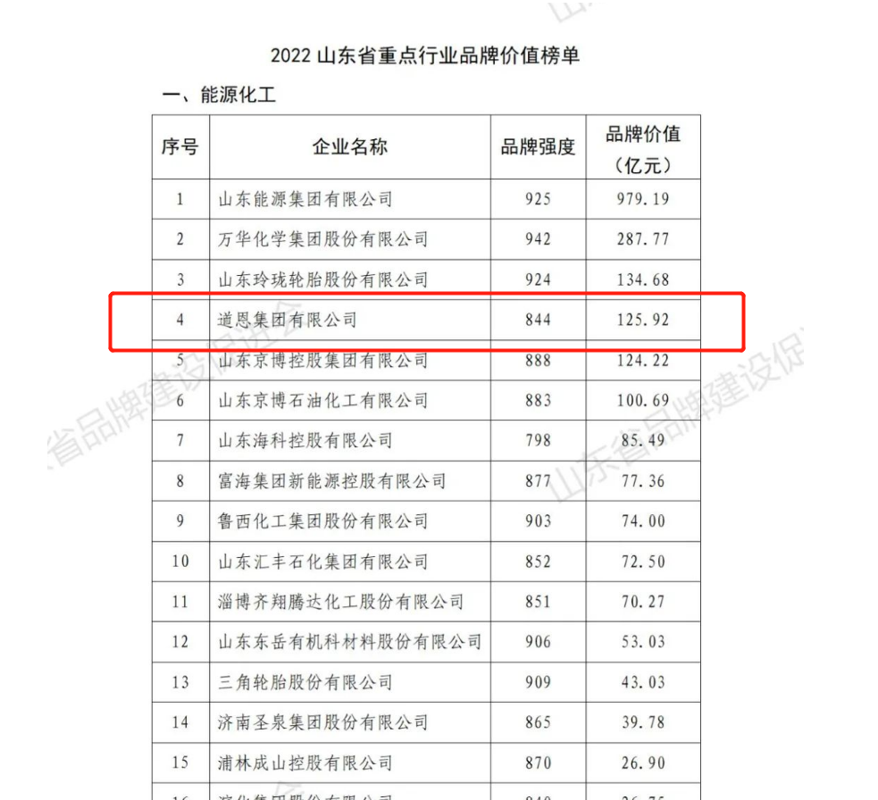 12月26日,2022年山東省重點行業品牌價值評價結果正式發布,道恩集團以品牌價值125.92億元、品牌強度844,位列能源化工行業榜單第4名,再創歷史新高。據悉,本次發布的品牌,涉及全省16個地市,其中煙臺市以36家上榜企業數量,位列16地市第一。