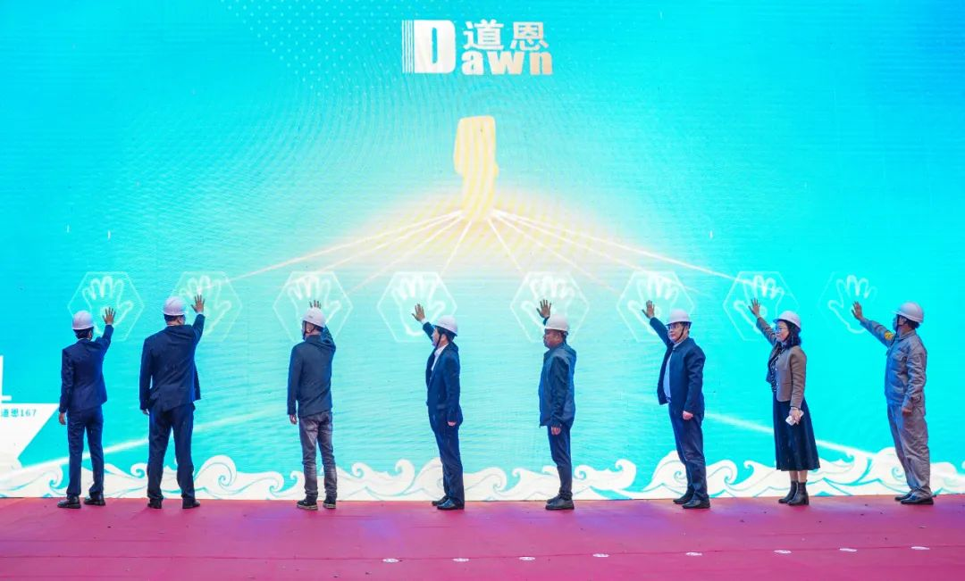 活動現(xiàn)場,彩旗招展。冒雨參加儀式的領(lǐng)導(dǎo)和嘉賓共同觀看了視頻短片,回顧了“道恩167”輪是怎樣建成的。